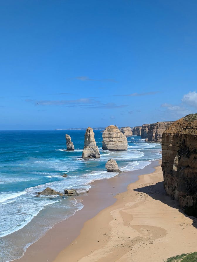 Arguably the most famous landmark on the Great Ocean Road, these towering limestone stacks rise dramatically from the Southern Ocean. Sunset is the best time for photography — the golden light against the cliffs is unforgettable.
